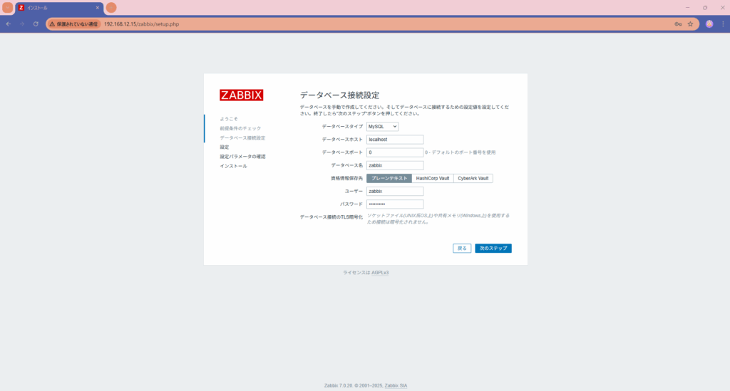 DBPassword=Zabbix@123差分確認# diff /etc/zabbix/zabbix_server.conf /etc/zabbix/zabbix_server.conf.BK