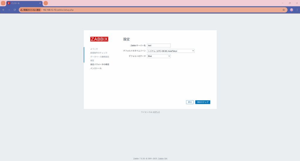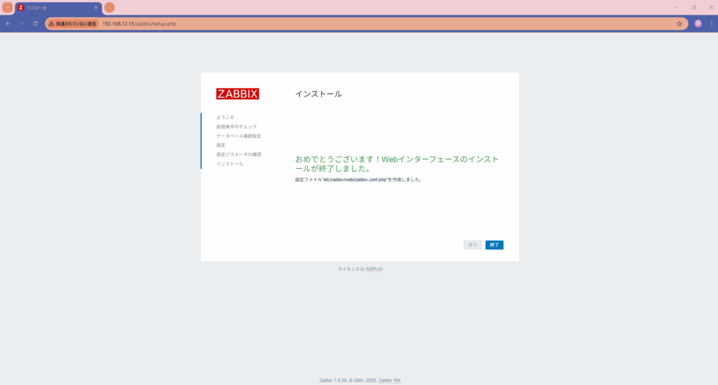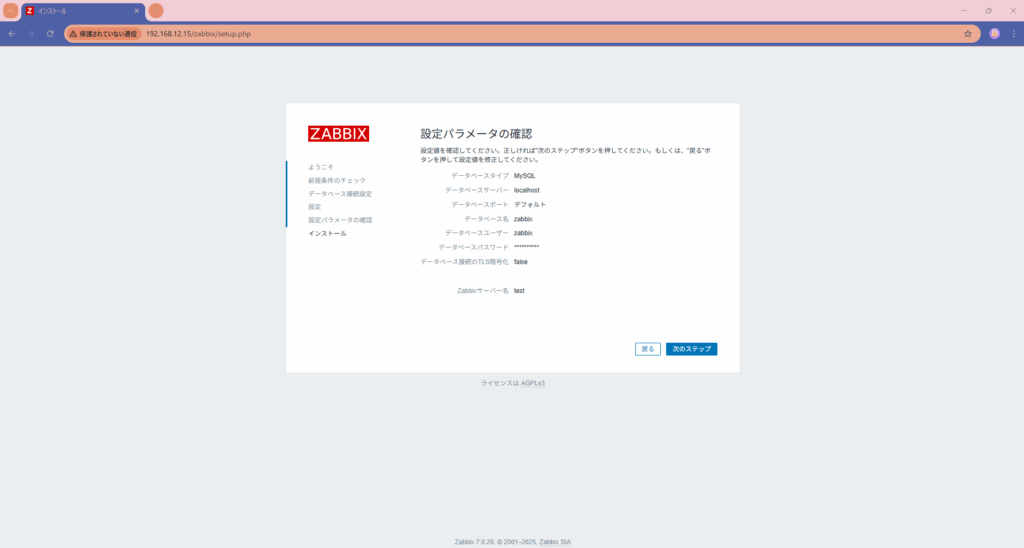 パラメータを確認し問題なければ次のステップ押下後にWebインターフェースのセットアップが完了する。