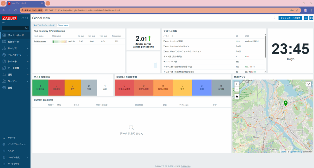 Webダッシュボード上で「Zabbixサーバーの起動 はい」が表示されていれば構築完了。
